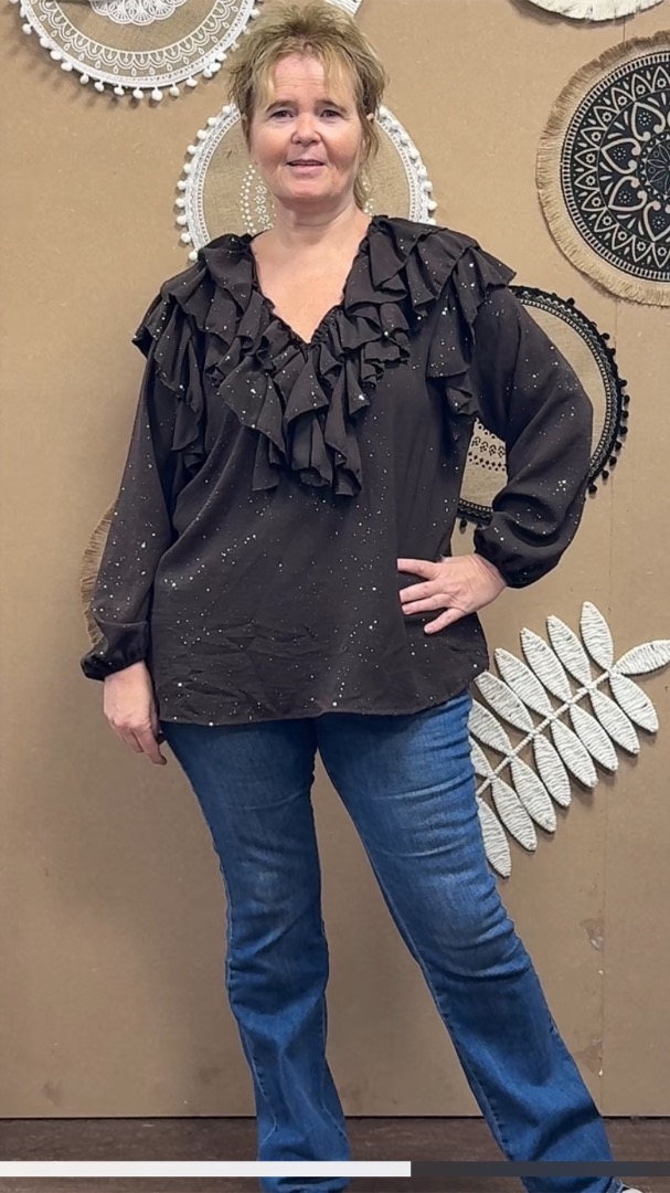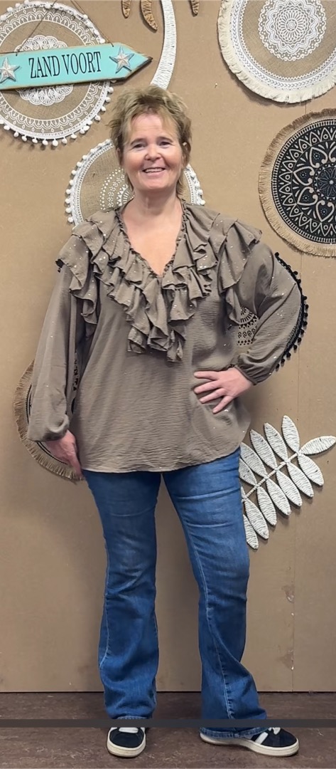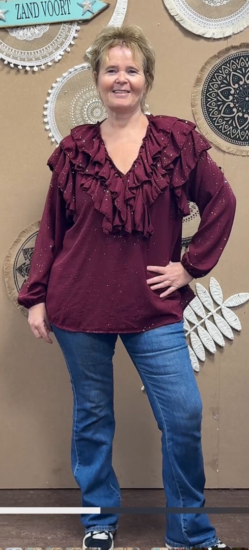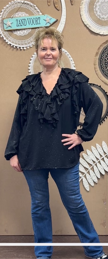 Zachte stof met subtiel glittertje en speelse roezels aan de voorkant — supervrouwelijk én comfortabel ????