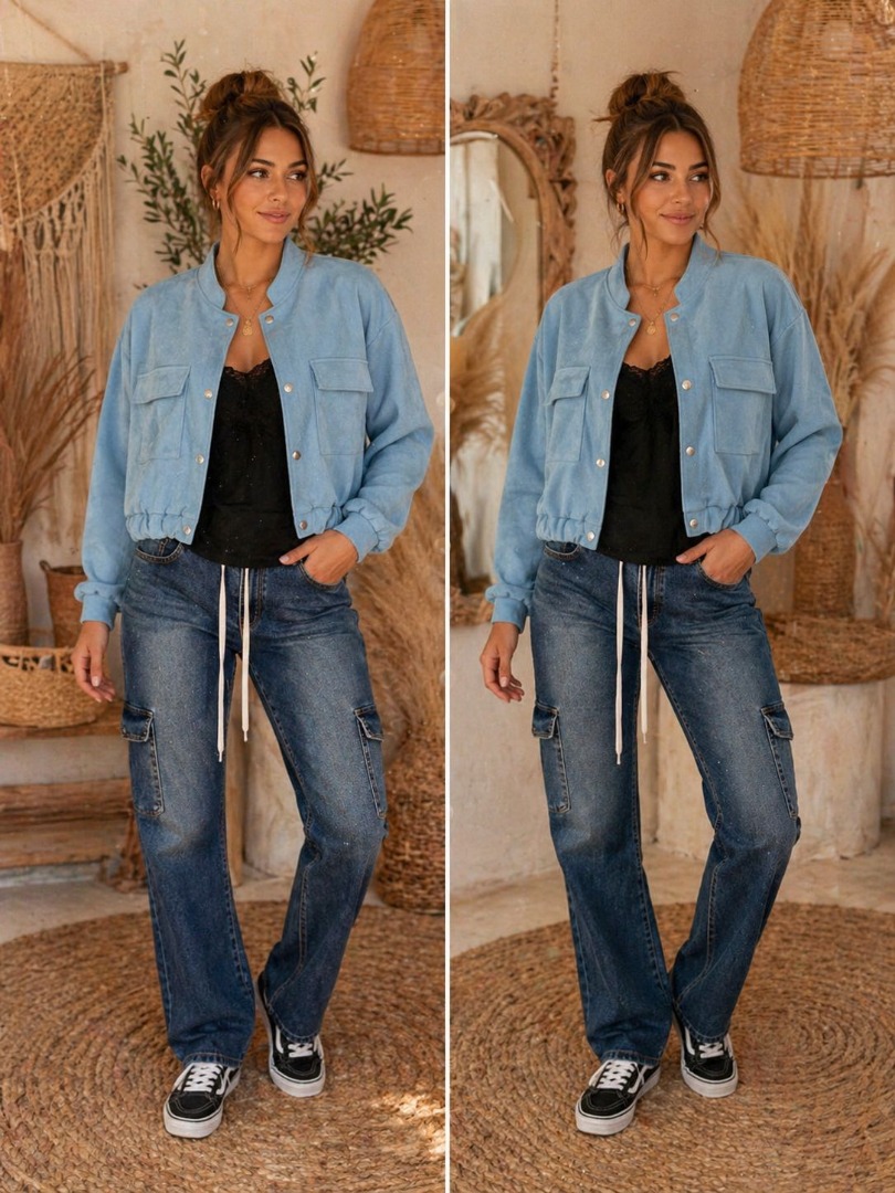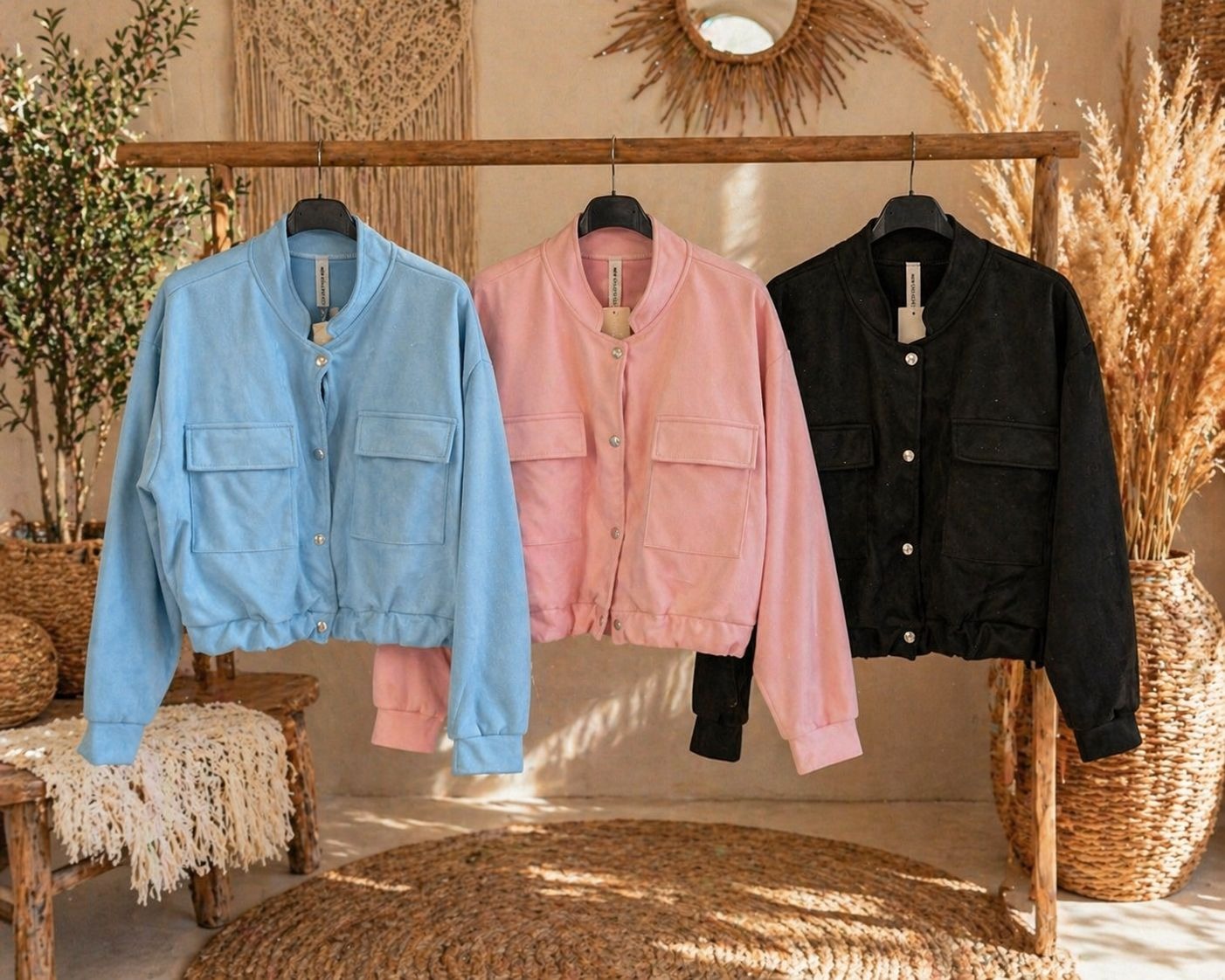 Trendy kort jasje van zachte suedine met een stoere vrouwelijke uitstraling.