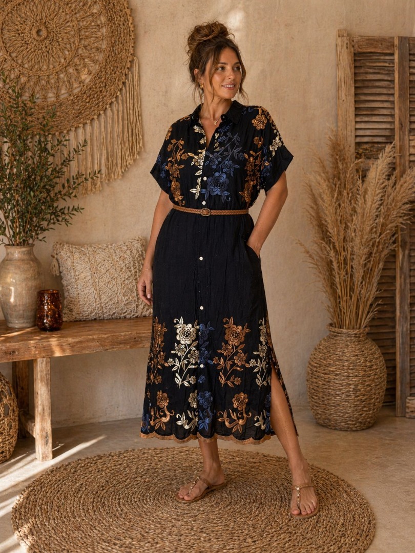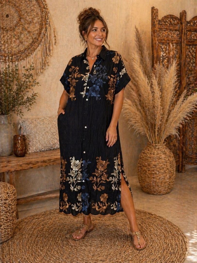 Boho jurk met bloemenprint, knoopsluiting en korte mouw. Soepel vallend en te dragen tot een maat 44/46